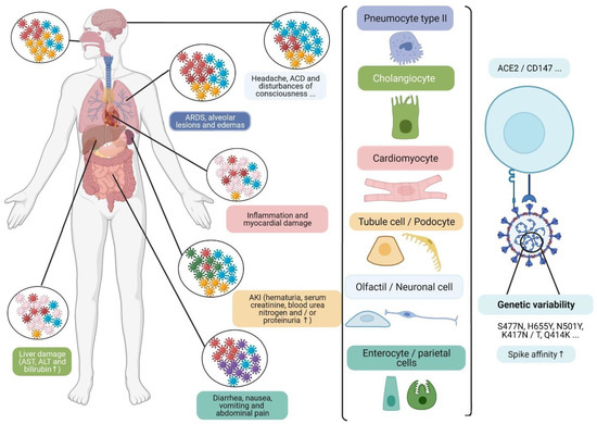 The development of viral quasi-species can modulate viral interaction with cell receptors in several tissues (type II pneumocytes, cholangiocytes, cardiomyocytes, tubular and podocyte cells, olfactory and neuronal cells, and enterocyte and parietal cells), particularly ubiquitous CD147 and ACE2R. This is, at least in part, due to the development of certain mutations, which may be associated with some clinical symptoms, and the elevation of certain biochemical markers in patients. Acute cerebrovascular disease (ACD); acute kidney injury (AKI); aspartate transaminase (AST); alanine transaminase (ALT); angiotensin-converting enzyme 2 receptor (ACE2R); differentiation cluster 147 (CD147) [48]. (Designed by biorender).