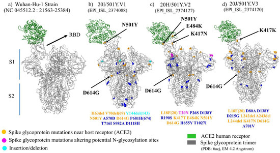 Tridimensional structure of Spike protein trimer in complex with host cell receptor ACE2. (a) 3D structure of Wuhan Strain Spike protein trimer; (b) 3D structure of Spike protein trimer of 20I/501Y.V1; (c) 3D structure of Spike protein trimer of 20H/501Y.V2; (d) 3D structure of Spike protein trimer of 20J/501Y.V3. S1 (Subunit 1); S2 (Subunit 2) [51].