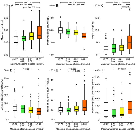 Maximum hematocrit (A), minimum plasma albumin (g/L) (B), weight change during hospital care (kg) (C), minimum platelet count (×109/L) (D), maximum blood leukocytes (×109/L) (E) and maximum plasma creatinine (µmol/L) (F) as grouped according to quartiles of maximum plasma glucose concentration. Boxplots with median, interquartile range, minimum and maximum within 1.5 interquartile range, and outliers displayed as circles and extreme values as asterisks. Bonferroni correction for multiple comparisons was applied in the post-hoc analyses.