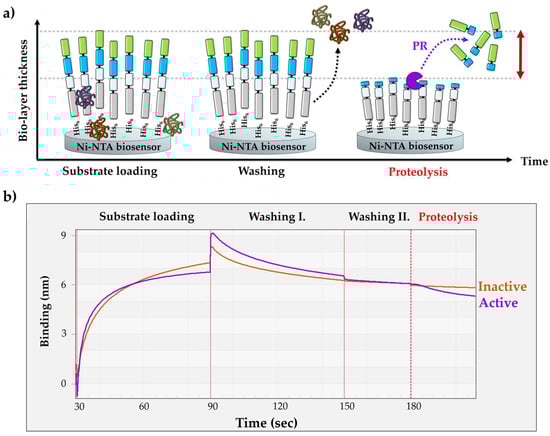 Although a wide variety of intermolecular interactions can be investigated by BLI, this method is not applied widely to measure enzyme activity. To date, only few studies have been reported about the investigation of enzyme activity by BLI. As an example, Kojima et al. studied the activity of horseradish peroxidase (HRP) in a real-time BLI-based assay, using an immobilized enzyme []. Most commonly, PRs are used in BLI assays to enzymatically remove remaining molecules from sensor surfaces [], but to our knowledge, the application of BLI in protease assays has not been published to date. Surface plasmon resonance (SPR) was shown to be suitable for the detection of protease activity via recombinant substrate-based technology [,], but in contrast to BLI, this method is not considered to be fully compatible with high-throughput screening (HTS).
