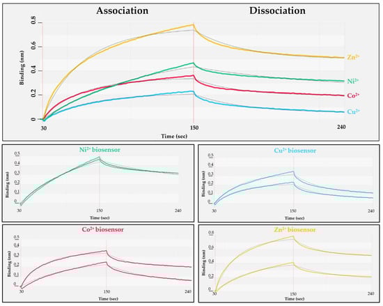 The polyhistidine sequence is known to exhibit strong binding to nickel. The NTA affinity surfaces charged with other divalent cations are also known to be suitable for the immobilization of His-tagged proteins in IMAC [,], but there is limited information about their binding kinetics to biosensors. The spontaneous dissociation of RFPs from the biosensor can be avoided by using such cations, which provide relatively small dissociation constant (kd) via sufficient interactions. Additionally, the setup of the conditions that enable regeneration of biosensors (and thereby reproducible binding curves) was also considered to be important when optimal assay conditions are to be determined. We have tested Zn2+, Ni2+, Co2+ and Cu2+ divalent cations for RFP immobilization (Figure 3).