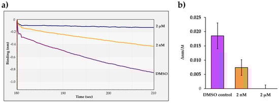 The His6-MBP-VSQNY*PIVQ-mEYFP substrate and HIV-1 PRwt were applied for the cleavage reactions together with atazanavir in 2 nM and 2 µM final concentration. Atazanavir was dissolved in dimethyl sulfoxide (DMSO), and therefore control reactions contained DMSO instead of the inhibitor solution. The most intensive signal change was observed for the control reaction (Figure 5a). As compared to the control, the slope of the signal was lower if atazanavir was applied in 2 nM final concentration, indicating only partial inhibition. In contrast, the change in the BLI signal was only marginal in the presence of 2 µM inhibitor, which implied that the enzyme was completely inhibited at the applied concentration (Figure 5b). Our results further confirmed that the change in the detected signal was caused by substrate proteolysis.