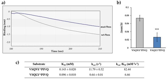 The suitability of the BLI-based protease assay for the comparative analysis of the cleavage efficiencies of different substrates was also tested. The experiments were performed by using His6-MBP-VSQNY*PIVQ-mEYFP substrate, which represents the wild-type MA/CA cleavage site of HIV-1 (wt-9res) []. A modified version of this substrate was also designed—the P2 residue of the cleavage site was changed to leucine (VSQLY*PIVQ) (mut-9res). The oligopeptide substrate representing the wild-type MA/CA cleavage site was found previously to be a better substrate of HIV-1 PR as compared to the P2-Leu mutant [,,]. Therefore, we expected that the preferential cleavage of the wild-type sequence can be determined by the BLI-based assay. The difference between the cleavage efficiencies was implied by the results of electrophoretic analysis, as well, where the turnover of mut-9res substrate was lower as compared to wt-9res (Figure 1).