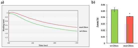 Examination of the substrate groove of HIV-1 PR. (a) A representative sensogram of the enzyme reactions performed with wt-24res and mut-24res substrates. (b) Comparison of obtained ∆nm/∆t values. The initial ∆nm/∆t values were determined based on the slopes (2–10 s after initiation of the reaction). *: p = 0.0463. Error bars represent SD (n = 2). Representative signal curves are shown for all steps of the assay in Figure S3c.