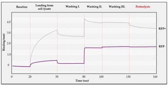 The transformation of BL21(DE3) cells, the protein expression and lysis of cells were performed as described previously []. After lysis, the cell suspensions were centrifuged at 10,000 g for 20 min, and the supernatants (cell lysates) containing the RFP substrate were collected. The lysates were used for BLI measurements and were analyzed by SDS-PAGE, as well, as it is described below.