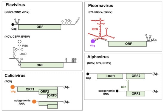 RNA viruses are a major threat to human health []. Their rapid evolutionary capacity favors spread among different organisms, and also can increase the probability of interspecies barriers crossing []. Viruses possessing single-stranded positive-strand RNA genomes include a large variety of human, animal, and plant pathogens. Among the different types of viruses belonging to this group, this review will be focused on the RNA regulatory regions present in flavivirus, picornavirus, alphavirus, and calicivirus (Figure 1). Representative members of these genera have been selected taking into consideration the presence of distinct type of regulatory elements within their genomes that are targeted by host RNA-binding proteins (RBPs) performing critical functions on the viral replication cycle.