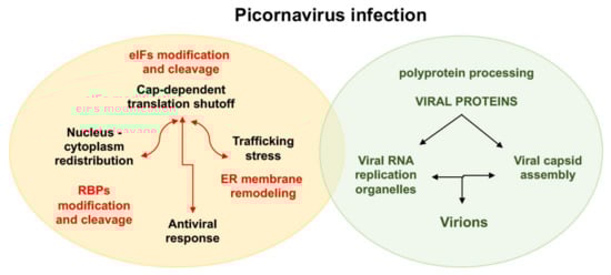 Schematic representation of main events in picornavirus infected cells. Following attachment of the virus to the receptor on the cell surface, internalization, and uncoating leads to release of the viral RNA into the cytoplasm of the host cell. The virus life cycle then proceeds to translation of the polyprotein precursor encoded in the viral genome through interaction with the host translation machinery (green oval). Processing of the polyprotein by viral encoded proteases renders the mature viral proteins required for virus multiplication. Viral RNA replication takes place in viral RNA replication organelles within reorganized cell membranes. Following assembly of viral capsids, the viral RNA is packaged into virions. Viral infection also alters host gene expression through activation of signaling pathways, and modification and/or proteolysis of host factors (eukaryotic initiation factors (eIFs) and RBPs) by viral proteases, inducing cap-dependent shutoff, nucleus-cytoplasm redistribution, trafficking stress, and antiviral response (yellow oval).