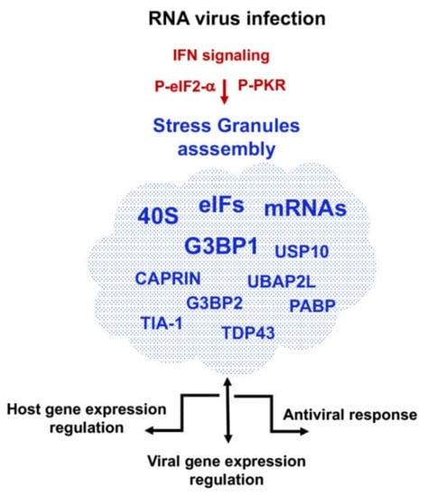 Strong stresses such as those induced by viral infections trigger a rapid inhibition of protein synthesis, ultimately leading to polysome disassembly and formation of stress granules (SGs) []. SGs are cytoplasmic membrane-less dynamic aggregates containing stalled pre-initiation complexes, which are thought to serve as sites of mRNA storage during the cell stress response []. Generally, SGs gather ribonucleoprotein particles (RNPs), enriched in mRNAs, eIFs, 40S ribosomal subunits, and RBPs. Marker proteins of SGs are Ras-GAP SH3 domain binding protein (G3BP1-2), Caprin, Ubiquitin Associated Protein 2 Like (UBAP2L), Ubiquitin Specific Peptidase 10 (USp10), PABP, Fragile X Mental Retardation Protein (FMR1), TAR DNA-binding protein 43 (TDP43), T-cell-restricted intracellular antigen-1 (Tia1), and Tia-1 related protein (TiaR) [,] (Figure 3).