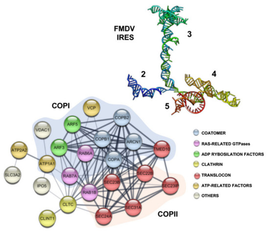 Host factors interacting with domain 3 of the FMDV IRES element. RNA structure model of the IRES element based on RNA Selective 2′ Hydroxyl Acylation analyzed by Primer Extension (SHAPE) probing (33) (top). The central domain (3) is colored in green. The functional association of proteins identified using the tRNA-scaffold methodology (123), interacting with domain 3 of the IRES, related to ER-Golgi vesicles trafficking was generated with STRING software (https://string-db.org). Factors involved in the anterograde (COPII) or retrograde (COPI) transport are marked by orange and blue shadow, respectively. Proteins are represented by circles and colored based on their functional grouping.