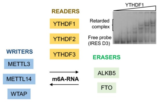 Diagram of m6A RNA modification enzymes. The proteins known as writers, readers, and erasers are depicted. The image on the right shows the interaction of YTH N6-methyladenosine RNA binding protein 1 (YTHDF1) protein with labeled domain 3 the FMDV IRES in RNA retarded gel shift assay.