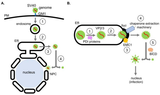 SV40 is composed of 72 pentamers of the VP1 coat protein that encloses its 5 kilobase-pair double-stranded DNA genome [6,7]; each VP1 pentamer contains either a VP2 or VP3 internal hydrophobic structural protein [8]. The native viral particle has a diameter of 50 nm when properly assembled. To initiate infection, SV40 interacts with the glycolipid GM1 ganglioside receptor at the plasma membrane [9], triggering receptor-mediated endocytosis that delivers the virus first to the endosome (Figure 1A, step 1) [10] and then the ER (Figure 1A, step 2) [11]. From this compartment, SV40 penetrates the ER membrane and escapes into the cytosol (Figure 1A, step 3) [12,13]. The virus disassembles in the cytosol and is then transported into the nucleus (Figure 1A, step 4) [12,14,15] where transcription and replication of the viral genome ensue, resulting in lytic infection or cellular transformation.