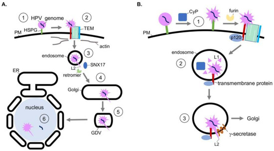 Structurally, HPV is a nonenveloped double-stranded DNA tumor virus composed of 72 pentamers of the major capsid protein L1. The L1 pentamers encase up to 72 copies of the minor capsid protein L2. Together, these encapsulate the 8 kilobase-pair double-stranded DNA genome [32]. The assembled virion has a diameter of 55 nm [33]. HPV infects mitotically active, basal epithelial cells by the initial binding of L1 to heparin sulfate proteoglycans (HSPGs) on the cell surface (Figure 2A, step 1) [34,35,36,37]. A series of conformational changes exposes the N-terminus of L2. L2 is then cleaved by the furin protease [38] and the viral particle is transferred to a tetraspanin-enriched microdomain (TEM) composed of tetraspanins CD151 and CD63, integrins α6 and β4, annexin A2, and an unidentified secondary receptor (Figure 2A, step 2) [39,40,41,42,43]. Next HPV is asynchronously endocytosed in a clathrin-, caveolin-, and dynamin-independent manner. Viral internalization is instead connected to actin polymerization [44,45].