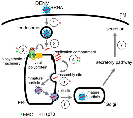 The actions of molecular chaperones have been reported to promote many of these distinct DENV entry steps. For instance, cytosolic Hsp70 chaperone, in concert with dedicated DNA J proteins, is thought to facilitate viral endocytosis, protein biosynthesis, and assembly [71]. Mechanistically, how Hsp70 mediates endocytosis of the incoming DENV particle remains unclear to date. However, Hsp70 can directly act on NS5 [71]—an RNA polymerase needed for replication of the RNA genome—to promote both the biosynthesis and activity of this enzyme (Figure 3, step 3); in this manner, Hsp70 indirectly supports viral replication (Figure 3, step 4) [71]. Hsp70 has also been shown to bind to and stabilize the C protein of DENV to promote viral assembly (Figure 3, step 5) [71]. Likewise, Hsp70 participates in the endocytosis, RNA genome replication, and viral assembly of the related ZIKV [72], presumably by imparting a similar mechanism as in DENV infection. In addition to Hsp70, other cytosolic chaperones including Hsp90 [73,74] and the TriC/CCT complex [75,76] have also been implicated in flavivirus infection, although a better understanding of their precise roles is needed.