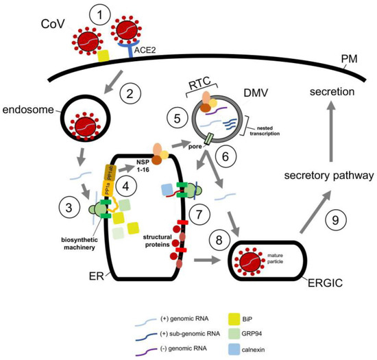 - Knoops, K.; Kikkert, M.; van den Worm, S.H.E.; Zevenhoven-Dobbe, J.C.; van der Meer, Y.; Koster, A.J.; Mommaas, A.M.; Snijder, E.J. SARS-Coronavirus Replication Is Supported by a Reticulovesicular Network of Modified Endoplasmic Reticulum. PLoS Biol. 2008, 6, e226. [Google Scholar] [CrossRef] [PubMed]
