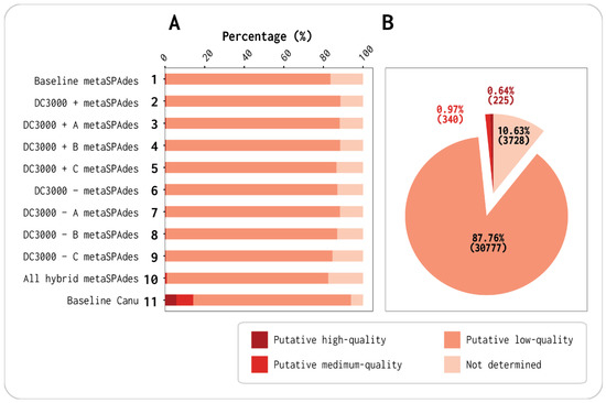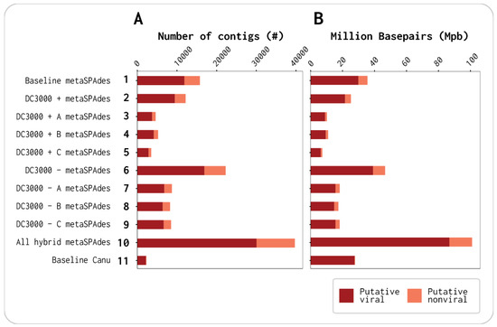 A total of 12 assemblies were generated using either metaSPAdes (v3.14.0, assemblies 1–9), hybrid metaSPAdes (v3.14.0, assembly 10), or Canu (v2.0, assemblies 11–12) with the Illumina reads, Illumina and Nanopore reads, or Nanopore reads polished with Illumina reads, respectively. These 12 assemblies were composed of the baseline (assembly 1), one assembly for each of the DC3000 + A–C viromes (assemblies 2–4), as well as one assembly for the combined Illumina reads of DC3000 + (assembly 5). The last six assemblies were each of the DC3000 − A–C viromes (assembly 6–8), one of the combined reads Illumina of DC3000 − (assembly 9), one with all Illumina and Nanopore reads concatenated from the seven viromes (assembly 10), a baseline with the long reads for assembly and polished with all short reads (assembly 11), and a baseline with the long reads for assembly and polished with short reads from only the baseline (assembly 12). Assemblies 1–11 are listed in Figure 1 with their respective assemblers, and assemblies 1–12 are listed in Tables S3 and S4 (Supplementary Materials).