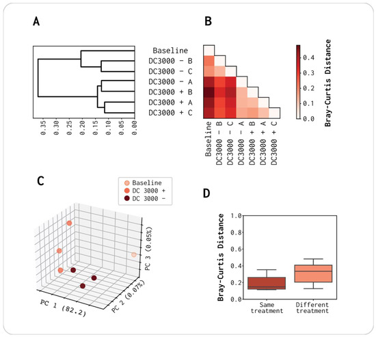 Viral OTU composition of the population present in the three replicates of virome DC3000 +, DC3000 −, and the baseline virome: (A) hierarchical clustering of vOTUs based on Bray–Curtis distances; (B) pairwise Bray–Curtis distances; (C) PCoA plot; (D) comparison of treatment incubation of OW in LB media at room temperature for 8 h with or without an overnight culture of DC3000. ANOSIM test statistic = 0.58 (p-value = 0.085).