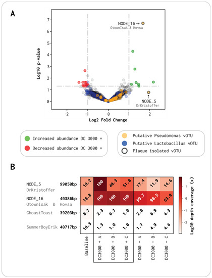 Eight contigs had a highly significant p-value (α = 0.05) with a Log2FC above 1 (Table S11, Supplementary Materials). Three of those were putative Lactobacillus phages, while one (NODE_3) was the complete genome of the Enterobacteria phage CAjan (accession no. KP064094.1) isolated from rat feces [65]. The most significantly abundant of those eight was NODE_16, potentially the complete genome of the phage OtownIsak and/or Hovsa (Figure 5A). Both phages were isolated using the plaque assay as described earlier, together with GhostToast, SummerboyErik, and DrKristoffer. The phage DrKristoffer is the same species as NODE_5, which had a higher Log2FC than NODE_16 but an insignificant p-value due to it having a high read abundance in only one of the DC3000 + viromes. Both GhostToast and SummerboyErik had a low abundance in all triplicates of DC3000 + and DC3000 −. If all five phages were the most effective at infecting and lysing the DC3000 strain in liquid media, their abundance would have been significantly high in all DC3000 + triplicates. As only OtownIsak or Hovsa were found to have a significant read abundance, it is plausible to assume that the three other phages are not effective in lysing in liquid media but are able to lyse in solid media as they can form plaques. Surprisingly, SummerboyErik was isolated by enrichment in liquid LB before direct plating with soft agar double overlay. From this, we would have expected SummerboyErik to be highly abundant after 8 h, but perhaps the phage has a longer lag phase and would have been significantly abundant in the DC3000 + viromes if left for longer. Another reason could be a limited burst size that would mask the abundance of SummerBoyErik to highly abundant phages.