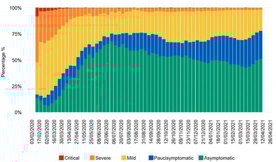 Epidemiological data of the Italian National Institute of Health (Istituto Superiore di Sanità, Rome, Italy) showing the clinical status of COVID-19 patients from January 2020 to April 2021. Colored bars represent the percentage of cases, respectively, with critical clinical conditions (top bars, dark red, clinical manifestations affecting the respiratory tract and/or other organ systems that require hospitalization in intensive care), with severe disease (orange bars, clinical manifestations affecting the respiratory tract and/or other organ systems that require hospitalization, not in intensive care), with mild disease (yellow bars, clinical manifestations affecting the respiratory tract and/or other organ systems that would not normally require hospitalization), with paucisymptomatic disease (blue bars, mild and general symptoms e.g., general malaise, fever, fatigue, etc.), and with asymptomatic disease (green bars, no apparent signs or symptoms of disease). Raw data in the xlsx format are publicly available at the Istituto Superiore di Sanità website www.epicentro.iss.it/coronavirus/sars-cov-2-dashboard (accessed on 23 April 2021).