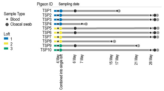A summary of the timeline of blood and cloacal swab sampling of the pigeons (TSP1-10) for the study.