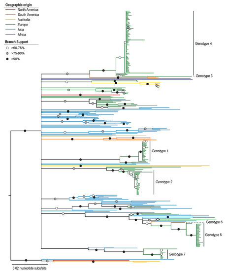 Neighbor-Joining phylogenetic tree of the PiCV genome sequences from this study together with those available in GenBank. Branches are color-coded based on the geographical sampling of the PiCV. The genotypes 1–7 represent sequences from this study.