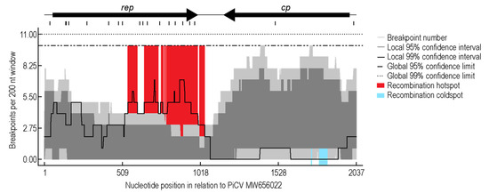 To investigate PiCV recombination dynamics, a pilot simulation of “housing together” naturally infected and non-infected animals originated from different maternal lofts was undertaken. The recombination analysis of the PiCV sequences from this study revealed 13 detectable recombination events. The recombination event detected in a large portion of the sequences was event 2, occurring in 109 genomes (Figure 4), and this recombinant region spans a ~100 nt region located at the 5’ portion of rep. Twelve of the recombination events detected are within the rep gene (Figure 4). We identified a recombination hotspot spanning the 3′ region of rep and the intergenic region, whereas a cold spot was identified near the 5′ region of the cp (Figure 5). These results differ from the previous hotspot detected in PiCV [35], which shows hotspots towards the 3′ end of the rep and cp, as well as the intergenic region. The differences in recombination patterns could be due to the variation in samples, i.e., global datasets with “circulating” recombinants as opposed to the ones in this study that address recombination in a short time frame within a small set of animals in a loft. The cold spot located in the cp, along with low amounts of recombination events, shows a higher region of conservation and importance of the cp likely for transmission and infectivity. Phylogenetic analysis of the genomes without recombination shows five clades present in the population (Figure 4) in contrast to the seven genotypes present in the Neighbor-Joining phylogenetic analysis (Figure 3).