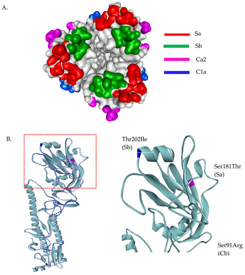 Three-dimensional structural analysis of A/H1N1 HA protein (A). Top view of head domain of H1N1 showing antigenic sites located in different regions of the HA molecule (B). Superimposed HA structures of A/Michigan/45/2015 (H1N1) and A/H1N1 Thai isolates, where mutations at antigenic sites are highlighted in blue, magenta, and red. HA structures were built based on the structure of A/California/07/2009(H1N1) HA protein, PDB ID: 3UBE.