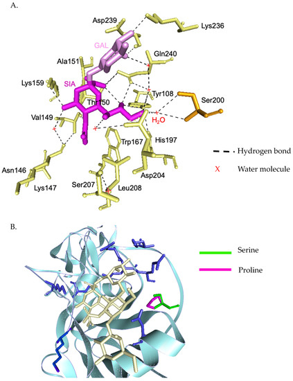 Three-dimensional structural analysis of H1N1 HA receptor binding site and interactions with the sialic acid receptor analogues (A). Residues and side-chain interactions of receptor binding site of A/Michigan/45/2015 (H1N1) HA protein and sialic acid. Ser200 and Asp204 together coordinate a water molecule that hydrogen bonds with the 9-hydroxyl group of sialic acid (B). Superimposed HA structures of A/Michigan/45/2015 (H1N1) and the mutant Ser200Pro. This results in a loss of coordination with water molecule, disrupting the hydrogen bond with sialic molecule.