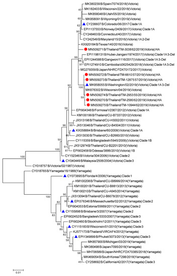 Phylogenetic tree of concatenate from all 8 genes of influenza B/Vic Thai strains was inferred by using the Maximum Likelihood method based on the Tamura 3-parameter model. Red circles indicate B/Victoria Thai isolates and blue triangles indicate influenza B vaccine strains.