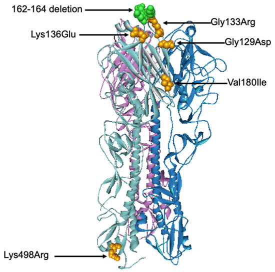 Three-dimensional structural analysis of the trimeric B/Colorado/06/2017 HA protein. Amino acid substitutions and deletion found in this study were highlighted in orange and green, respectively. The structure of B/Brisbane/60/2008 Influenza Hemagglutinin protein (PDB ID: 4FQM) was used as a template.