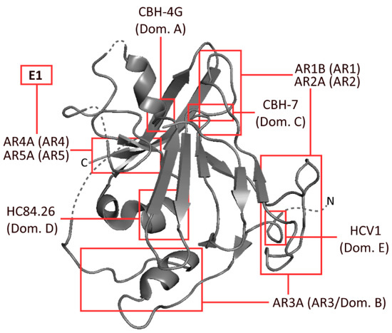Several epitopes have been identified on E1 and E2 by independent groups, resulting in largely inconsistent nomenclature. The epitopes most widely referred to are the antigenic regions (ARs) 1-5, domains A–E and epitopes I–III (Figure 1). Amongst these incongruous epitope definitions lie several which largely overlap with one another, or even represent identical binding residues [9,10,11]. These residues are typically defined by alanine scanning mutagenesis (ASM) studies. Domains D and E, which form part of epitope I and epitope II, respectively, are predominantly linear, whereas most other epitopes that were similarly analysed were comprised of non-linear residues (Table 1, Figure 1) [9,12,13,14,15,16,17].