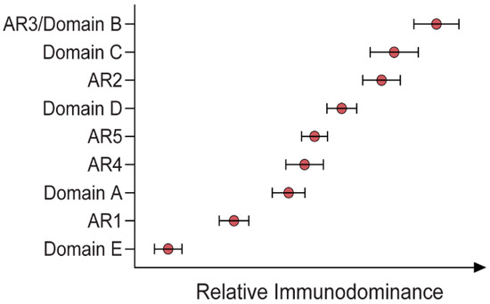 Relative immunodominance of Abs specific to antigenic regions (ARs) 1–5 and domains A–E of a GT1 viral envelope (H77) [30].