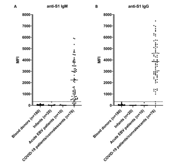 Specificity of the COVID-19 SIA. (A) Results for anti-S1 IgM. (B) Results for anti-S1 IgG. The control panel included sera from blood donors, infants, patients with acute Epstein-Barr virus (EBV) infection, and patients/convalescents with COVID-19. The dashed line indicates the assay cut-off of 300 MFI and the vertical line the median. MFI, median fluorescence intensity; Ig, immunoglobulin; COVID-19, Coronavirus disease 2019; SIA, suspension immunoassay; S1, spike subunit 1.