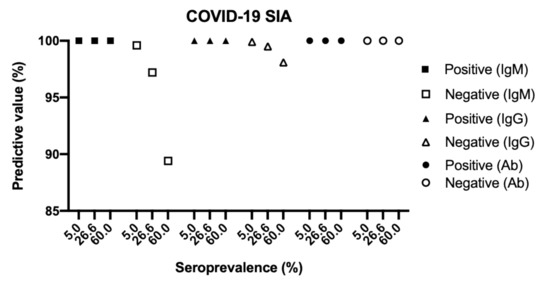 Predictive values of the COVID-19 SIA at three different seroprevalences. The predictive values were plotted as a function of seroprevalence using the values for sensitivity and specificity in Table 4 and the following formulas: Positive predictive value = (seroprevalence * sensitivity) / ((seroprevalence * sensitivity) + ((1 − seroprevalence) * (1 − specificity))); Negative predictive value = ((1 − seroprevalence) * specificity) / ((seroprevalence * (1 – sensitivity)) + ((1 – seroprevalence) * specificity)). COVID-19, Coronavirus disease 2019; SIA, suspension immunoassay; Ig, immunoglobulin, Ab, IgM + IgG.