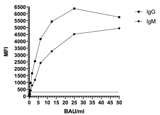 Sensitivity testing of the COVID-19 SIA, using the WHO international standard for anti-SARS-CoV-2 immunoglobulins. The dashed line indicates the assay cut-off of 300 MFI. MFI, median fluorescence intensity; BAU, binding antibody unit; Ig, immunoglobulin.