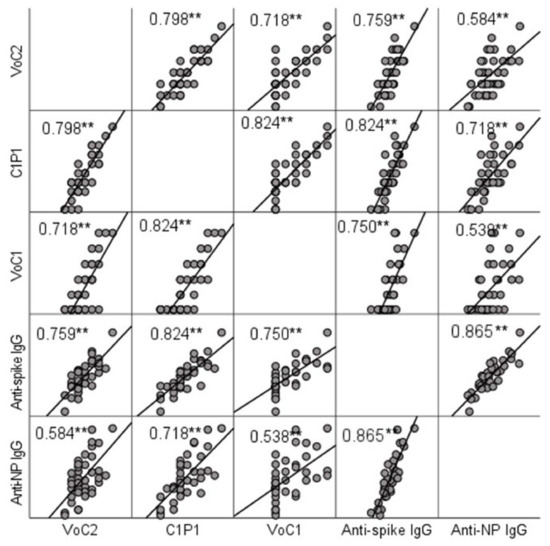 NAb titers were compared to IgG titers determined by ELISA. A significant positive correlation (p < 0.001) with Spearman’s rho-values ranging between 0.584 (anti-NP and VoC2) and 0.824 (anti-spike and C1P1) was found between MNT and ELISA result in all cases (Figure 2, Table S3). Anti-spike-IgG and anti-nucleoprotein-IgG titers did not show a significant difference (p = 0.960).