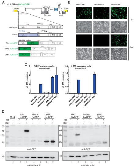 Substitution of the matrix-encoding sequence with huGFP allows Rev-independent expression. (A) Depiction of the proviral HIV-1 construct NL4.3Ren (upper part). The LTRs are marked as yellow rectangles. The Rev response element is highlighted in blue. Below a magnification of the gag ORF is shown. Matrix (MA) as well as capsid (CA) and nucleocapsid (NC) are interspaced by the spacer peptides SP1 and 2. At the very C-terminus, the p6 protein is depicted. Next, a chimeric Gag is shown consisting of a sequence optimized part (light violet, up to the SpeI restriction site) and wild type sequences. At the bottom, the three different positions of GFP insertions (humanized (hu) or adapted to HIV nucleotide bias (hiv)) are illustrated: between the matrix and capsid (MAhuGFP/MAhivGFP), after the first 45 nt (i.e., 15 amino acids) of matrix (MA45huGFP/ MA45hivGFP), and at the ATG of matrix (∆MAhuGFP/∆MAhivGFP). The GFP ORF is terminated by a STOP codon followed by a small deletion in CA, leaving the rest of Gag untranslated (light gray dashed rectangles). (B) Light and fluorescence microscopy pictures of HEK 293T cells transfected with the different proviral constructs with or without a Rev expression plasmid. (C) Flow cytometry analysis of relative GFP expression levels of HEK 293T cells transfected with the indicated constructs. The percentage of GFP expressing cells was normalized to the overall transfection efficiency using β-galactosidase expression as a control for transfection efficiency (n = 3). Error bars represent SD. Both the huGFP and hivGFP expression levels were separately normalized to the MAhuGFP + Rev or MAhivGFP + Rev control, respectively. (D) Western blot using protein extracts from the indicated co-transfections. Detection was performed with an anti-eGFP antibody. Actin served as a loading control. A size marker in kDa is indicated on the left.