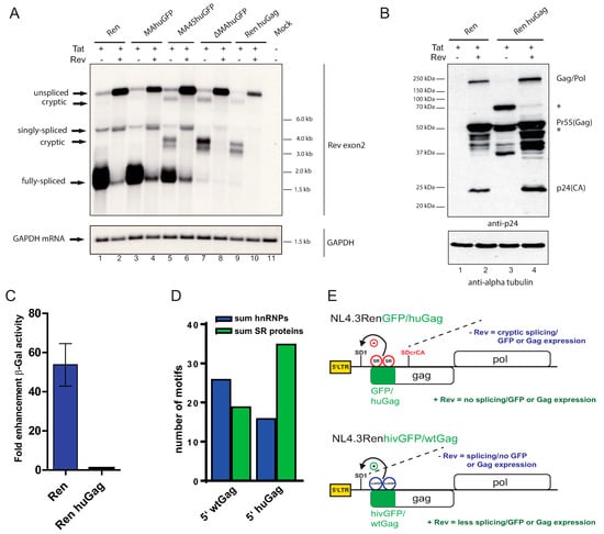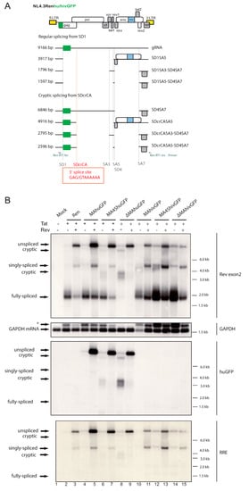 - Chang, D.D.; Sharp, P.A. Regulation by HIV Rev depends upon recognition of splice sites. Cell 1989, 59, 789–795. [Google Scholar] [CrossRef]