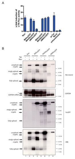 3.2. The huGFP Sequence Misregulates HIV-1 Splicing in a Position-Dependent Manner