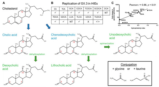 Bile acid pathways. (A) Primary bile acids (blue) are synthesized from cholesterol in the liver. Bacteria in the intestine convert primary bile acids to secondary bile acids (green) through dehydroxylation or epimerization. Carbons 3, 7, and 12 are indicated in red. Bile acids can be conjugated to glycine or taurine (box). (B) The effect of bile acids tested individually on HuNoV GII.3 infection of enteroids [1]. ✓ = permitted infection, X = did not permit infection, ✓/– = intermediate effect, NT = not tested at 500 µM due to cytotoxic effects (derived from Murakami et al., 2020 [1]). (C) Fold change in GII.3 genome equivalents correlates with the hydrophobicity indices of the bile acid used during infection. The solid line depicts the best-fit linear regression (R2 = 0.73, p < 0.01). The Pearson correlation coefficient (r) and p value (p) are noted (from Murakami et al., 2020 [1]).
