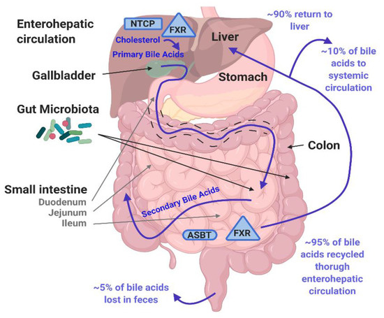 Enterohepatic circulation. Tissue expression locations of BA transporters ASBT (oval) and NTCP (rectangle) and BA binding protein FXR (triangle) discussed in this review are indicated. BAs are generated in the liver from cholesterol, stored in the gallbladder and then enter the duodenum in the small intestine. The gut microbiota in the small intestine and colon convert primary BAs into secondary BAs. Most (95%) BAs are actively reabsorbed in the ileum or passively reabsorbed in the jejunum and colon and recycled through enterohepatic circulation. Created with BioRender.com, accessed on 9 March 2021.