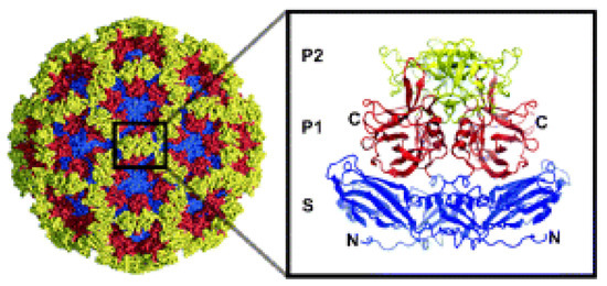 - Smith, H.Q.; Smith, T.J. The Dynamic Capsid Structures of the Noroviruses. Viruses 2019, 11, 235. [Google Scholar] [CrossRef]