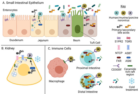 Models for bile acid-mediated infection by noroviruses in different cell types. (A) Bile-dependent and -independent human noroviruses infect duodenal, jejunal, and ileal HIEs. The mechanism of GII.3 BA mediated infection in HIEs is well characterized in jejunal HIEs [1]. MNV infects tuft cells of the mouse ileum [54]. (B) PoSaV infects porcine kidney cells in a BA-dependent manner described below. (C) MNV infects immune cells (right) [55,56]. BAs influence replication of MNV in different regions of the intestine (left). Adapted by permission from Springer Nature: Springer Nature, Nature Microbiology, from ref. [4], copyright (2019). Created with BioRender.com, accessed on 12 March 2021.