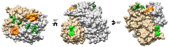 Bile acid binding sites on the GII.10 HuNoV P-domain. Monomers of the GII.10 P-domain dimer colored in grey and tan. Dark green: BA binding site identified by Kilic et al. with GCDCA complexed [81]. Light green: putative low affinity BA binding site reported by Creutznacher et al. [82]. Orange: HBGA binding site complex with 3-fucosyllactose (from Weichert et al., 2016) [45].