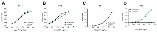 GCDCA enhances GII.2 VLP but not GI.1, GII.3, and GII.4 VLP binding to PGM. (A–D) VLPs were tested for their ability to bind to PGM (source of HBGAs) by ELISA in the presence or absence of 500 µM GCDCA. VLPs used are described in Table 1. Previously unpublished data (A,C,D). Derived from Murakami et al., 2020 (B) [1]. The PGM binding assays performed are described in Murakami et al., 2020 [1].