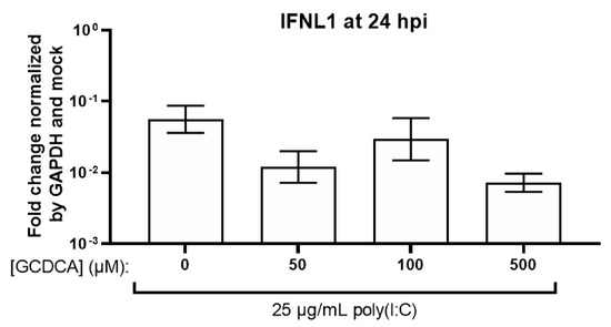 GCDCA in combination with poly(I:C) treatment of HIEs does not induce a greater type III IFN response. Jejunal HIEs were treated with 25 µg/mL poly(I:C) and increasing concentrations of GCDCA. At 24 h post treatment, mRNA levels of IFNL1 (shown), IFNL2, and IFNL3 were assayed. Previously unpublished data. Poly(I:C) treatment of HIEs and RT-qPCR for mRNA levels of type III IFNs performed as in Lin et al., 2020 [108].