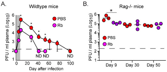 Accelerated control of chronic viremia following Rb therapy is dependent on adaptive immune responses. (A) Plasma viral titers from LCMV-Clone 13 (Cl13) infected C57BL/6 mice either PBS contro-treated (red circles) or treated with Ribavirin (Rb; purple circles) were determined at the indicated time point. Data are expressed as PFU per milliliter of plasma. Shaded area indicates time of Rb treatment (day 1–8 after infection). Each time point represents the average ± standard deviation (SD) of 4 mice per group. ND = not detected. (B) Infectious virus in the plasma of LCMV-Cl13 infected Rag−/− mice either PBS-treated or treated with Rb. Each circle represents a single animal. Data are representative of 2 experiments with 3–4 mice per group. * p < 0.05; one-way ANOVA.