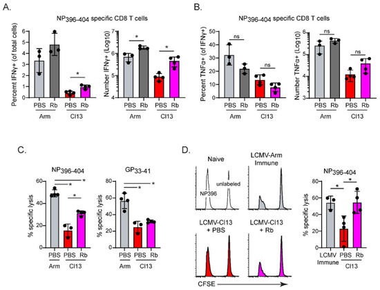 Early prevention and long-term functional rescue of high-affinity CD8 T cells. (A,B). Splenocytes from PBS-treated or Rb-treated LCMV-Arm or LCMV-Cl13 infected C57BL/6 mice were analyzed on day 9 after infection. Graphs illustrate (A) the frequency and number of IFNγ-producing, and (B) of TNFα and IFNγ double producing NP396–404-specific CD8 T cells following ex vivo peptide restimulation. The bars represent the average ± SD of 4 mice (individual circels) in each group and represent multiple experiments. *, p < 0.05. (C) In vitro 51Cr release activity against target cells coated with LCMV-NP396–404 peptide or LCMV-GP33–41 peptide (effector:target ratio of 50:1) on day 9 post infection. (D) In vivo CTL assay (day 50 after infection). Peptide-unlabeled or NP396–404 peptide-labeled target cells (splenocytes) were co-transferred into LCMV-naïve mice, LCMV-Arm immune mice (day 50 after infection) or LCMV-Cl13 infected mice (day 50 after infection) that were either PBS-treated or had been treated with Rb on days 1 to 8 after infection. Histograms show a single mouse with each condition, and the bar graph indicates the percent NP396–404-specific lysis. The bar graph shows the average ± SD of 3 (Arm infection) or 4 (Cl 13 and Cl 13 + Rb infections) mice per group. The circles on each bar represent individual mice. * p < 0.05; student’s t-test (unpaired, two-tailed).
