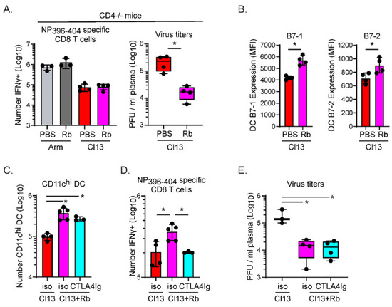 CD4 T cells and prolonged costimulation are required in combination with lower virus replication to prevent CD8 T cell deletion. (A). Splenocytes from PBS-treated or Rb-treated LCMV-Arm or LCMV-Cl13 infected CD4−/− mice were analyzed on day 9 after infection. The bar graph represents the number of IFNγ-producing NP396–404 specific CD8 T cells and is the average ± SD of 4 mice per group. Box and whisker indicate day 9 virus titers in PBS-treated and Rb-treated CD4−/− mice infected with LCMV-Cl13. In the box and whisker plots, the midline represents the median and the error bars the minimum and maximum values (whiskers). Circles indicate individual mice. (B). Bars indicate the mean fluorescence intensity (MFI) of B7-1 and B7-2 expression on splenic CD11chi dendritic cells in PBS treated or Rb-treated mice on day 9 after LCMV-Cl13 infection. Circles indicate the MFI in individual mice. (C–E). Splenocytes from PBS-treated or Rb-treated LCMV-Cl13 infected mice were analyzed on day 9 after infection. Mice were treated with PBS or Rb and then on days 4–8 after infection given CTLA4-Ig or an isotype antibody. Bars indicate (C) the number of CD11chi dendritic cells, (D) the number of IFNγ-producing NP396-specific CD8 T cells, and (E) plasma virus titers. Data are representative of 2 or more experiments with 3–5 mice per group. * p < 0.05; student’s t-test (unpaired, two-tailed).