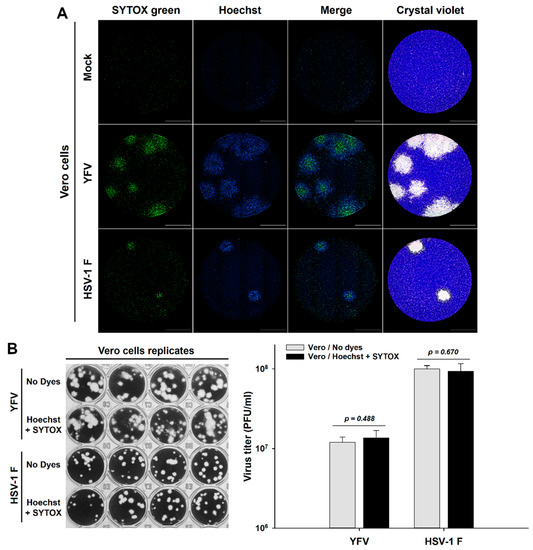 Labeling of virus-induced cytopathic effect with DNA fluorescent dyes has no effect on the replication of RNA and DNA animal viruses. (A) Vero cells were inoculated with either YFV or HSV-1 F seeds, cell nuclei were Hoechst stained, and cells were subjected to plaque assay during 120 h with a medium containing the cell death staining SYTOX Green. After live-cell imaging acquisition, viral plaques were confirmed by the standard crystal violet staining. (B) Vero cells were inoculated with either YFV or HSV-1 F seeds and subjected to plaque assay for 120 h both in the presence or absence of the DNA fluorescent dyes Hoechst and SYTOX Green. Plaques were revealed and counted using the standard crystal violet staining for the calculation of viral titers. A representative experiment is shown in each panel (n = three independent experiments), total magnification of 40X, scale bar = 2000 µm.