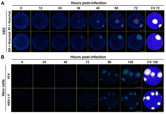 Vero cells were seeded on µClear black 96-well plates (Greiner Bio-One) at a density of 25,000 cells/well with MEM supplemented with 10% FBS. Wells from the periphery of the plate were not used to seed cells and were filled instead with 1X PBS in order to avoid desiccation in the wells with cells during long-term incubations. After 24 h of incubation at 37 °C with 5% CO2, cells were infected with 10-fold serial dilutions of either infectious or UV-inactivated VSV-NJ, HSV-1 F, HSV-1 F-ΔgE-GFP, or YFV 17D viruses. After 2 h of adsorption, cells were labeled with 1 µg/mL Hoechst 33342 (Invitrogen) for 10 min, washed once with 1X PBS supplemented with 1% FBS and incubated for 72–120 h at 37 °C −5% CO2 with MEM AutoModTM supplemented with 2% FBS, 1% carboxymethylcellulose, and 2.5 µg/mL of propidium iodide (Invitrogen) or 500 nM of SYTOX Green (Invitrogen). Washing and media addition steps were done fast and carefully in order to avoid desiccation that could kill and label with the death markers the cells on the periphery of the wells. The incubation was carried out using the above-mentioned conditions into the chamber of a Lionheart™ FX automated microscope (BioTek). Images of the whole well were acquired every 3–24 h. After the final read, viral plaques were confirmed by crystal violet staining. Automated plaque counts and single-cell analysis of viral plaques were performed by image analysis with the software CellProfiler 4.0 (http://www.cellprofiler.org; Broad Institute), using our previously reported pipelines for plaque identification (PlaqueIdentification.cpproj) and plaque tracking (PlaqueTracking.cpproj) [14], as well as a new customized pipeline for the quantification of chromatin-condensed and dead cells within individual plaques (PlaqueTrackingSX&Hoechst.cpproj, Supplementary Material). A detailed visual representation of this procedure is described in Figure S1.